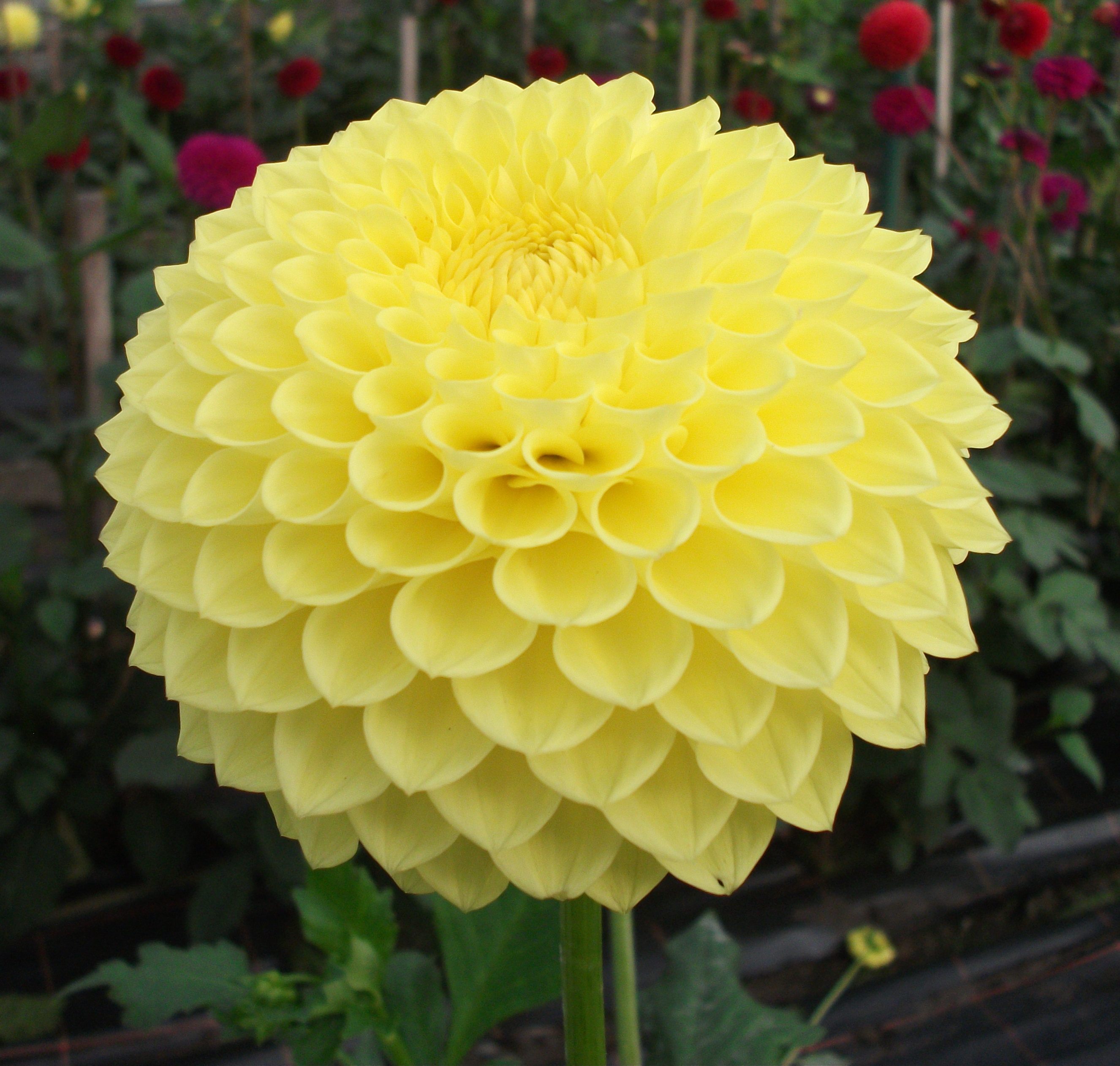 Decorative dahlias have fully double blooms showing no disc. The ray florets
